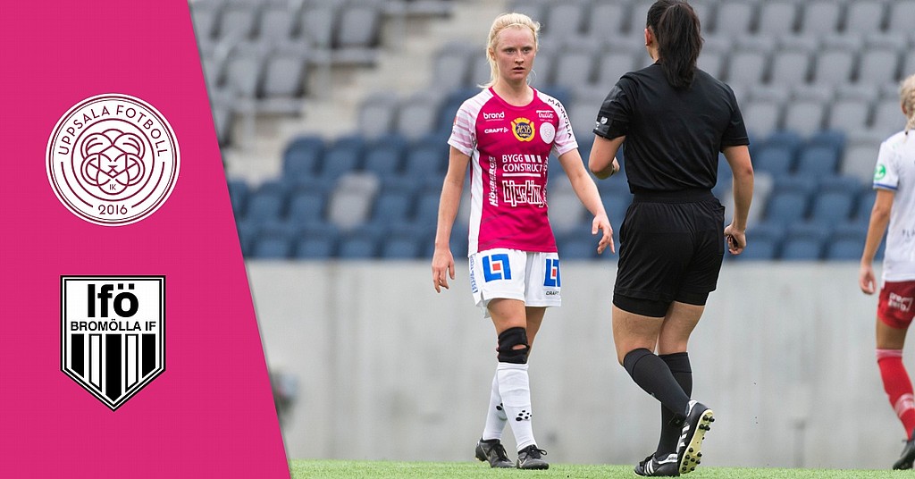 Uppsala var ute efter tre poäng för att fortsätta haka på i toppstriden och kampen om direktplatsen till OBOS Damallsvenskan. Hemmalaget började lite trevande första kvarten, men sedan började laget rulla igång och skapa chanser framåt. Trots spelövertag och många chanser framåt ville inte bollen in och Bromölla höll emåt. Uppsala fick en gyllene chans att ta ledningen efter en tveksamt dömd straff, men avslutet tog i ribban och det var som att allting gick emot hemmalaget. Då klev Hanna Persson fram och satte 1-0 med bara sekunder kvar att spela av den första halvleken, ett psykologiskt viktigt mål.